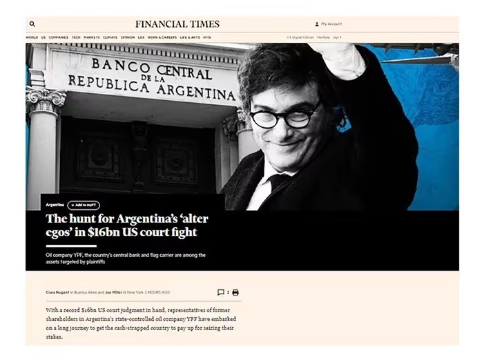 También apunta a YPF, Arsat y Enarsa. Dice que son “alter egos” del Estado argentino, cuenta el Financial Times, que…