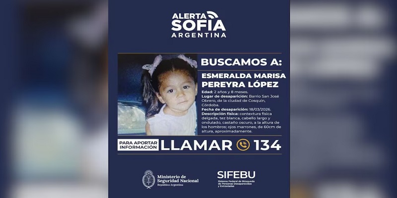 El Ministerio de Seguridad Nacional ha activado la Alerta Sofía, un mecanismo de difusión masiva ante la posibilidad de secuestro. Se ha proporcionado una descripción detallada de Esmeralda: mide aproximadamente 60 centímetros, es de contextura delgada, tez blanca, con cabello castaño largo y ondulado hasta los hombros, y ojos marrones. Al momento de su desaparición, vestía un body gris. Se insta a cualquier persona con información a contactarse a través de las líneas 134 o 911, o a acercarse a cualquier sede policial.
