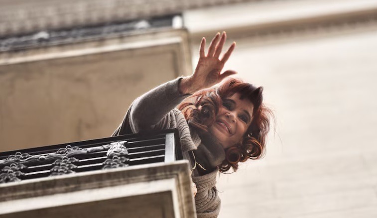 Cristina Kirchner saluda desde el balcón de su domicilio, donde cumple la condena de prisión por el caso Vialidad