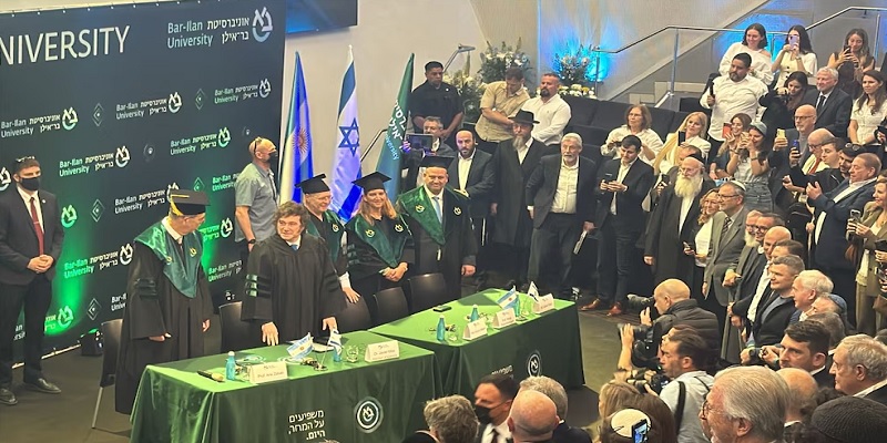 Tel Aviv, Israel – En el marco de su visita oficial a Israel, el presidente argentino Javier Milei recibió este domingo un Doctorado Honoris Causa de la Universidad de Bar-Ilan, donde fue ovacionado de pie. Durante su discurso ante un auditorio colmado, Milei expuso su visión sobre la situación global, la economía, la política y la ética, haciendo hincapié en la confrontación ideológica y cultural que, según él, define el panorama actual.